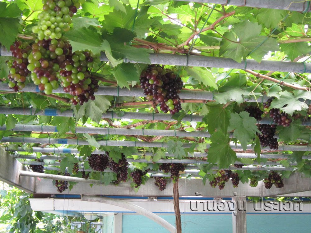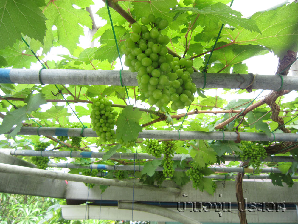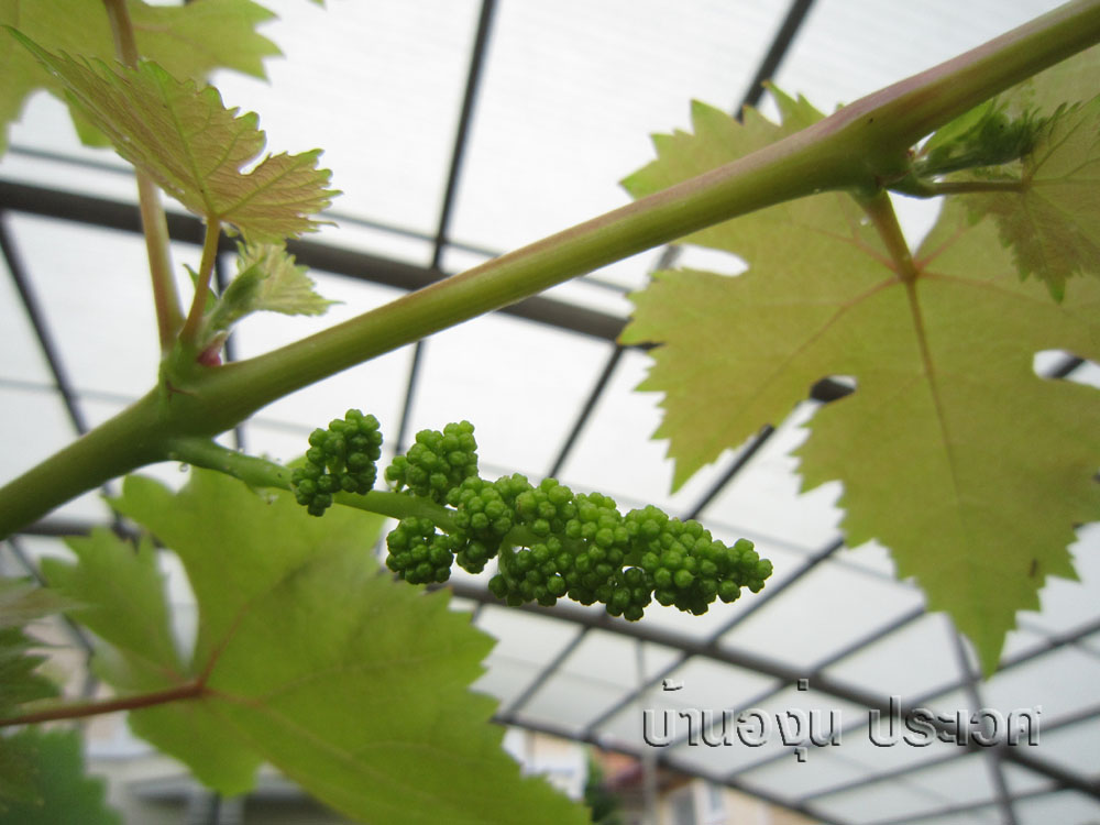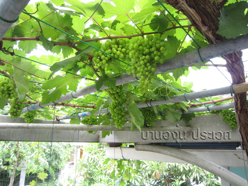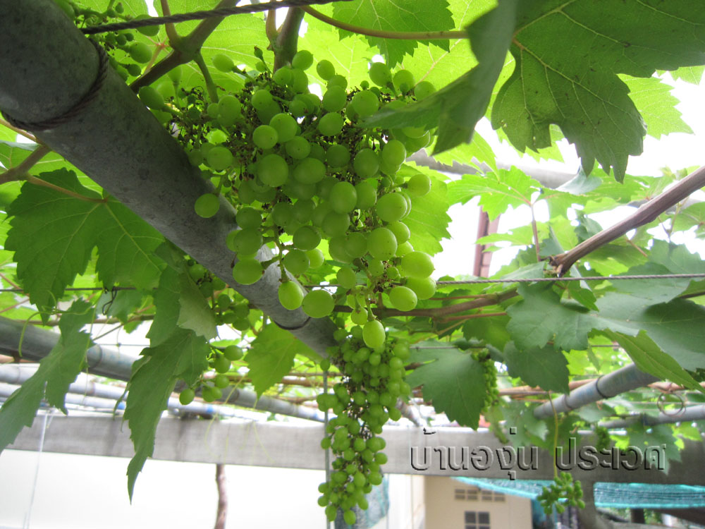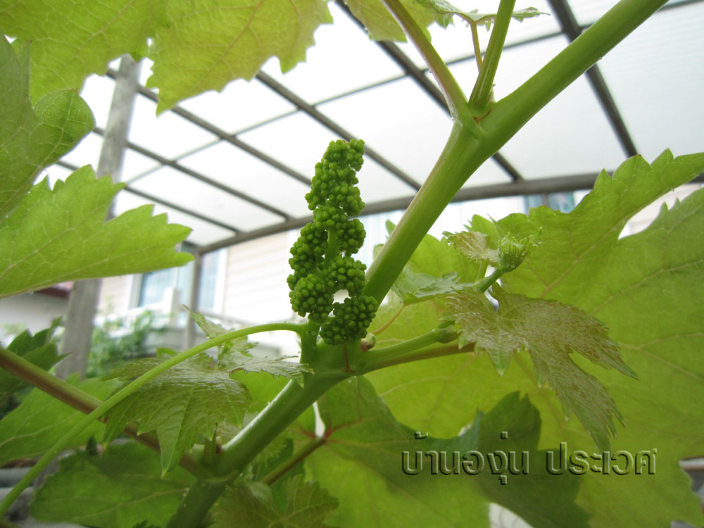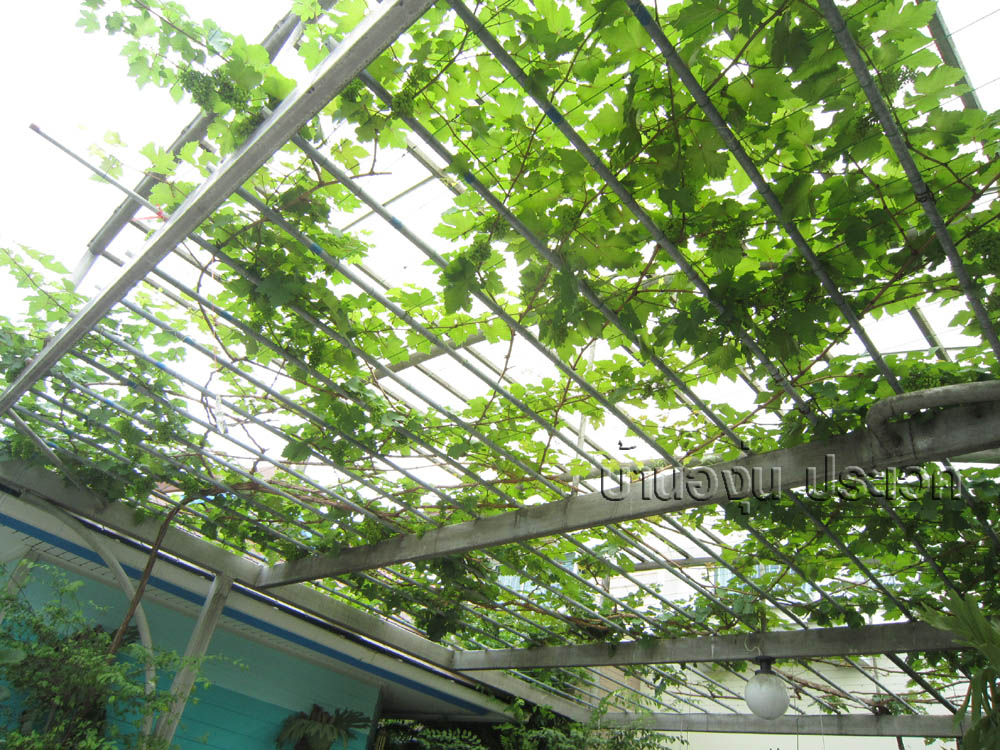 องุ่น ปลูกในเมืองก็ได้ ง่ายนิดเดียว บ้านองุ่นภาค 2 มาปลูกองุ่นประดับหน้าบ้านกันเถอะ ภาค 2 ( ย้ายบ้าน ) บ้านองุ่นภาคแรก มีพื้นที่ 2 x 3 เมตร ปลูก 1 ต้น ย้ายมาที่ใหม่มีพื้นที่ปลูกขนาด 6 x 6 เมตร ปลูกองุ่น 2 ต้น ไร้เมล็ด 1 ต้น มีเมล็ด 1 ต้น ที่เห็นอยู่นี่เป็นหลังคาโรงจอดรถแบบเอนกประสงค์ มีหลังคาโปร่งแสงกันฝนโรงรถ แต่ปล่อยแสงผ่านให้กับองุ่น ส่วนองุ่นก็รับหน้ากันแสงให้พื้นโรงรถ ท่อระแนงที่วางไว้ก็เอาไว้ห้อยเฟิร์นและกล้วยไม้ต่างๆ มีใบองุ่นช่วยบังแสงให้ บนร้านองุ่นสามารถขึ้นไปเดินหรือขึ้นไปนั่งทำงานได้ มีพื้นที่ให้องุ่นเลื้อยกว้างขวางเลื้อยกันสบายไปเลย ช่วงนี้องุ่นกำลังเริ่มติดผลมาชมกันครับ ร้านองุ่นนี้เหมาะมากเพราะมีหลังคากันฝน องุ่นเมื่อติดผลแล้วโดนฝนผลมักแตก หรือหากวันใดฝนตกปรอยๆ แค่เป็นละอองพอเปียกจะไม่เป็นผลดีต่อองุ่นเพราะมันเป็นฝนกรดเนื่องจากกรุงเทพฯ มีผลพิษเยอะ แต่ร้านองุ่นนี้มีหลังคาป้องกันฝนอย่างดีซึ่งเป็นผลพลอยได้จากหลังคาโรงรถ แต่ปัญหาคือหลังคาโปร่งแสงแบบนี้จะเสียแสงไปบางส่วนทำให้องุ่นได้รับแสงไม่เต็มที่ สังเกตได้จากบริเวณด้านในติดผลน้อยกว่าด้านมุมฝั่งตะวันออกที่โดนแสงอาทิตย์สาดเต็มๆ ในช่วงครึ่งเช้า ติดผลมากกว่าตลอด พื้นที่มากมายปลูกแค่ 2 ต้น เลื้อยกันสบายเลย ดอกองุ่นช่วงยังตูม
