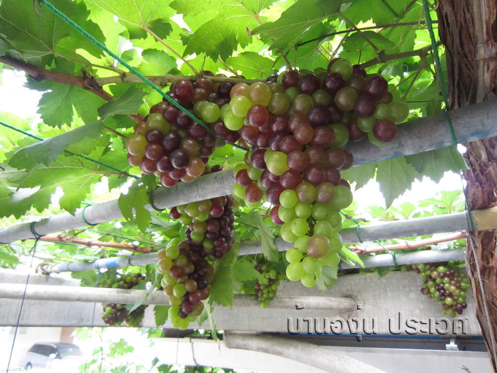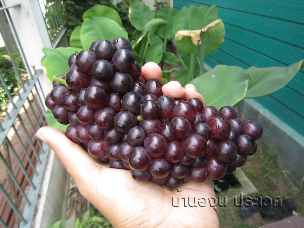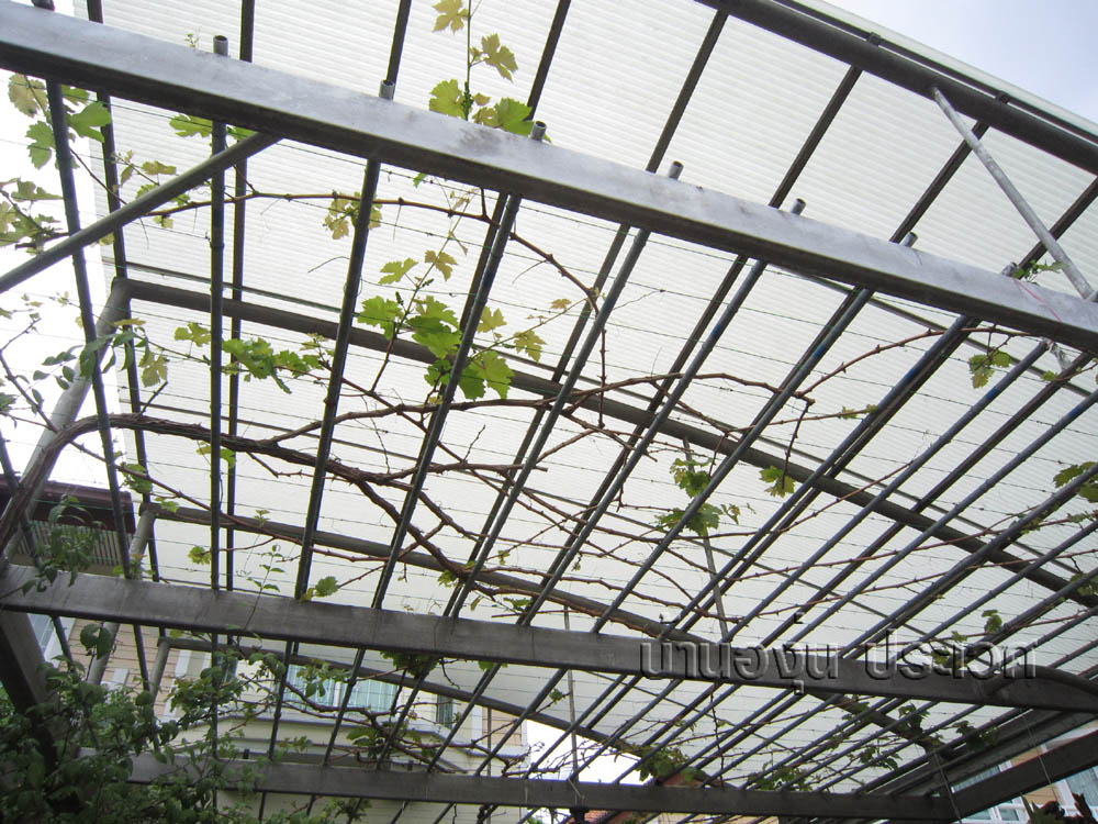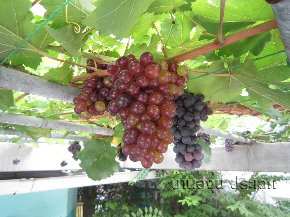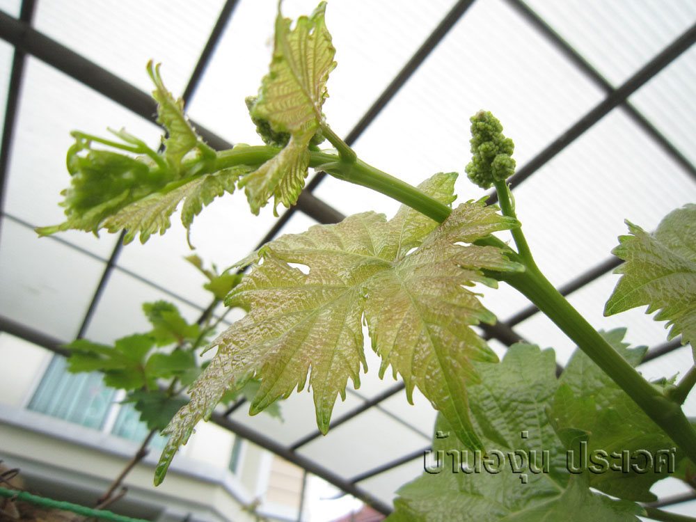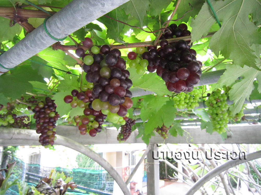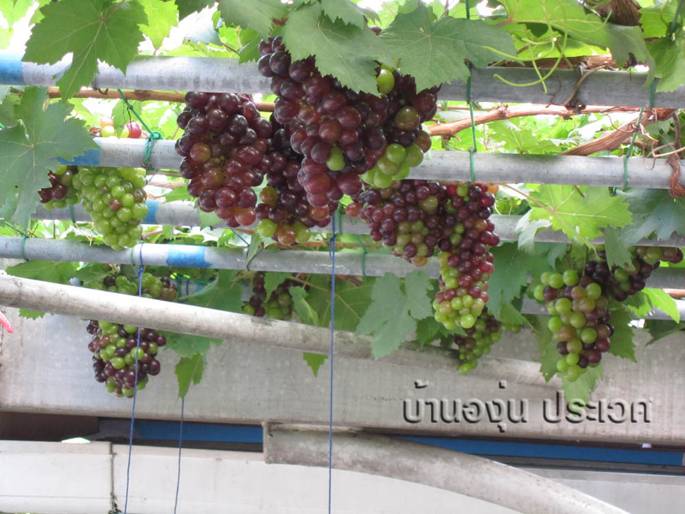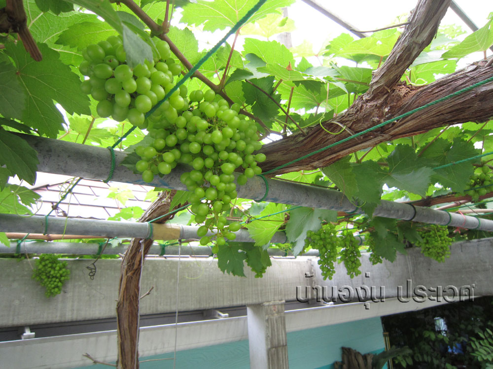 องุ่น ปลูกในเมืองก็ได้ ง่ายนิดเดียว บ้านองุ่นภาค 2 มาปลูกองุ่นประดับหน้าบ้านกันเถอะ ภาค 2 ( ย้ายบ้าน ) บ้านองุ่นภาคแรก มีพื้นที่ 2 x 3 เมตร ปลูก 1 ต้น ย้ายมาที่ใหม่มีพื้นที่ปลูกขนาด 6 x 6 เมตร ปลูกองุ่น 2 ต้น ไร้เมล็ด 1 ต้น มีเมล็ด 1 ต้น ที่เห็นอยู่นี่เป็นหลังคาโรงจอดรถแบบเอนกประสงค์ มีหลังคาโปร่งแสงกันฝนโรงรถ แต่ปล่อยแสงผ่านให้กับองุ่น ส่วนองุ่นก็รับหน้ากันแสงให้พื้นโรงรถ ท่อระแนงที่วางไว้ก็เอาไว้ห้อยเฟิร์นและกล้วยไม้ต่างๆ มีใบองุ่นช่วยบังแสงให้ บนร้านองุ่นสามารถขึ้นไปเดินหรือขึ้นไปนั่งทำงานได้ มีพื้นที่ให้องุ่นเลื้อยกว้างขวางเลื้อยกันสบายไปเลย ช่วงนี้องุ่นกำลังเริ่มติดผลมาชมกันครับ ร้านองุ่นนี้เหมาะมากเพราะมีหลังคากันฝน องุ่นเมื่อติดผลแล้วโดนฝนผลมักแตก หรือหากวันใดฝนตกปรอยๆ แค่เป็นละอองพอเปียกจะไม่เป็นผลดีต่อองุ่นเพราะมันเป็นฝนกรดเนื่องจากกรุงเทพฯ มีผลพิษเยอะ แต่ร้านองุ่นนี้มีหลังคาป้องกันฝนอย่างดีซึ่งเป็นผลพลอยได้จากหลังคาโรงรถ แต่ปัญหาคือหลังคาโปร่งแสงแบบนี้จะเสียแสงไปบางส่วนทำให้องุ่นได้รับแสงไม่เต็มที่ สังเกตได้จากบริเวณด้านในติดผลน้อยกว่าด้านมุมฝั่งตะวันออกที่โดนแสงอาทิตย์สาดเต็มๆ ในช่วงครึ่งเช้า ติดผลมากกว่าตลอด พื้นที่มากมายปลูกแค่ 2 ต้น เลื้อยกันสบายเลย ดอกองุ่นช่วงยังตูม