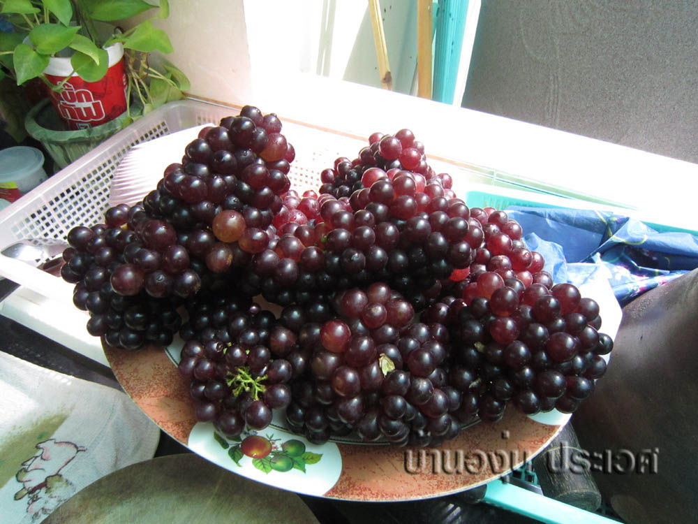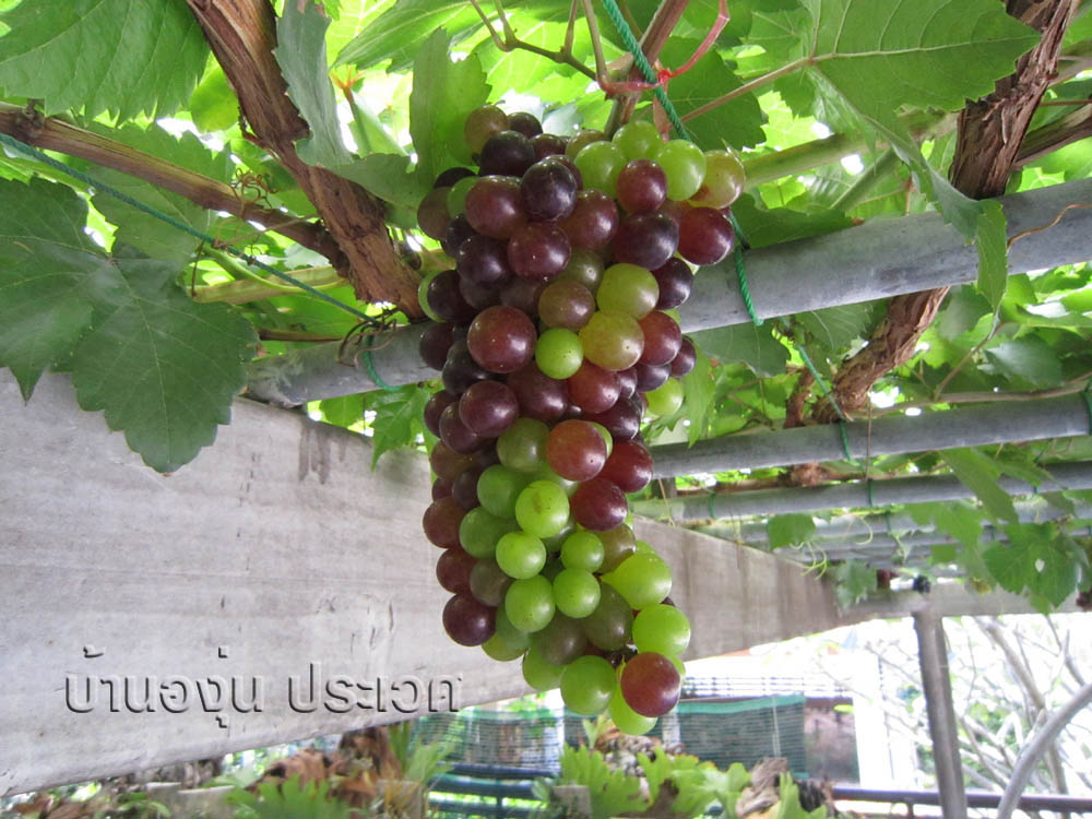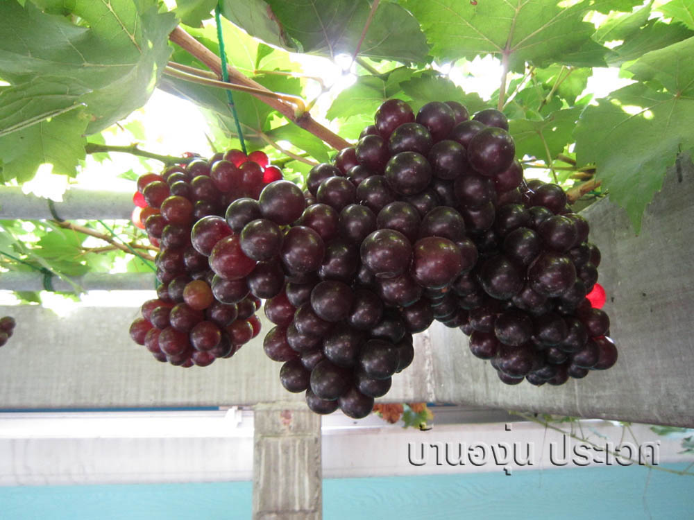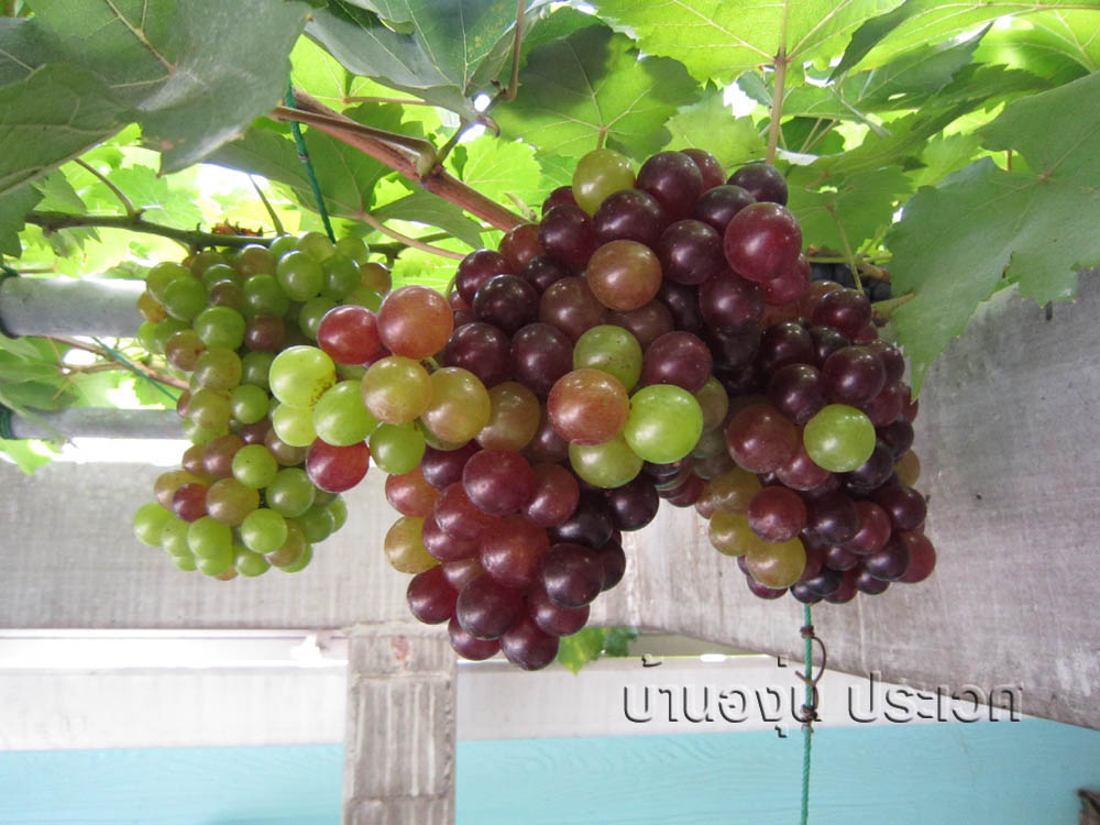 ที่บ้านปลูกองุ่น 2 ต้น 2 สายพันธุ์ ภาพด้านบนพวงสีแดงนั่นคือองุ่นมีเมล็ดในช่วงเปลี่ยนสี ส่วนพวงสีดำพวงถัดไปเป็นพันธุ์ไร้เมล็ด แต่รสชาดสู้องุ่นพันธุ์มีเมล็ดไม่ได้เลย |