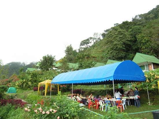 โต๊ะกลมบริเวณแค้มป์ไฟ ตรงกลางคือกองไฟ โต๊ะนั่นคือโต๊ะอาหารค่ำของเรา หนาวๆ มีกองไฟก็ได้บรรยากาศดี แต่มีปัญหาเรื่องควันไฟเข้าตา ลมพัดไปทางโน้นที ทางนี้ที บังคับทิศทางลมไม่ได้ เลยเปลี่ยนไปทานที่ระเบียงคลับเฮาท์ดังที่เห็นหลังคาแหลมๆ ด้านหลังของภาพ